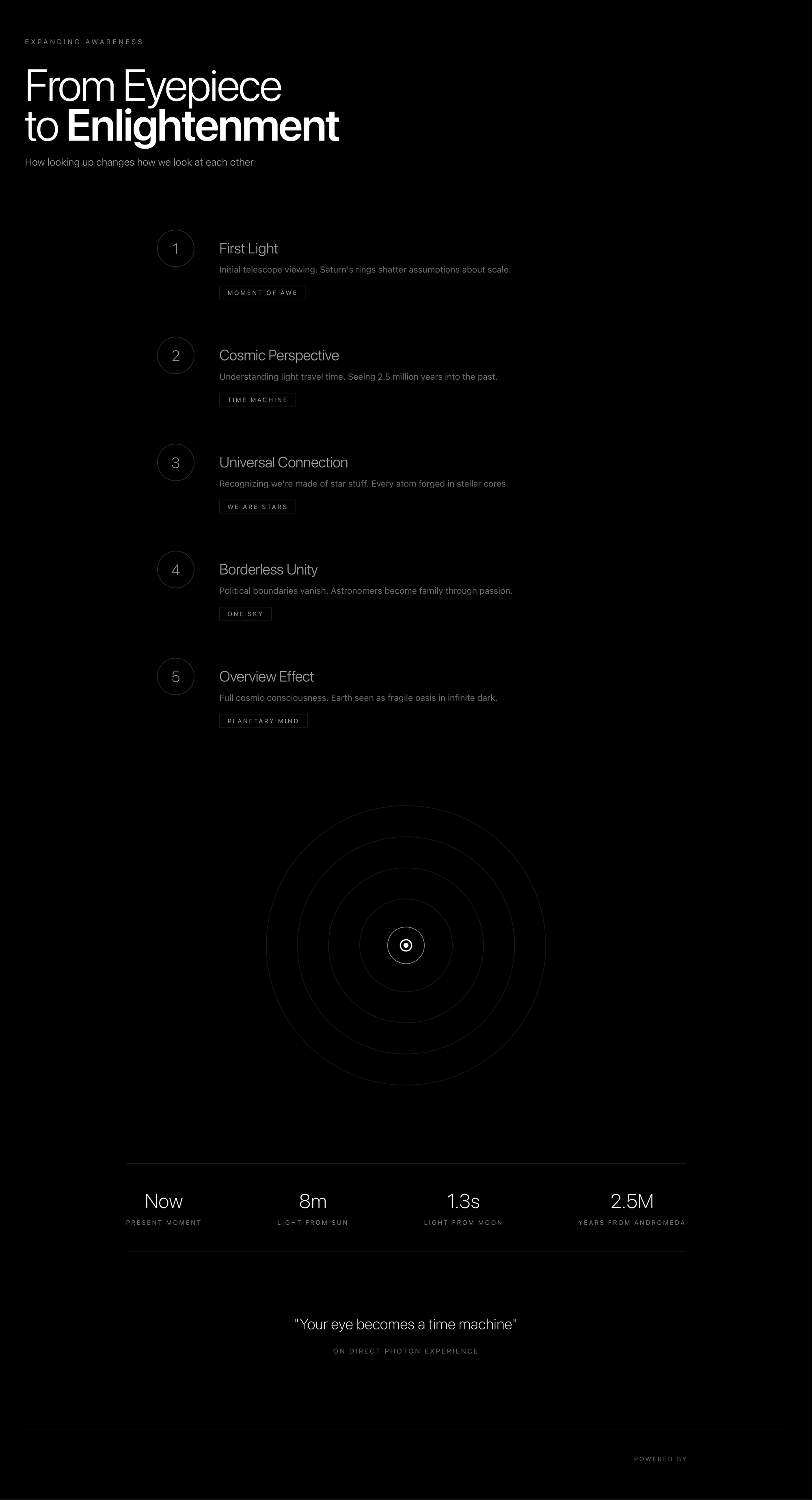 The practice began outside the gate to Mount Wilson Observatory in the mountains above Los Angeles in the 1970s. Ancient light from the Andromeda galaxy reached his naked eye, photons that had traveled 2.5 million years arriving without mediation. No screens, no processing, just radiation from another galaxy hitting the human retina directly. That moment of temporal vertigo, seeing millions of years into the past, reoriented his understanding of scale and time. He has spent his life engineering similar moments for others.