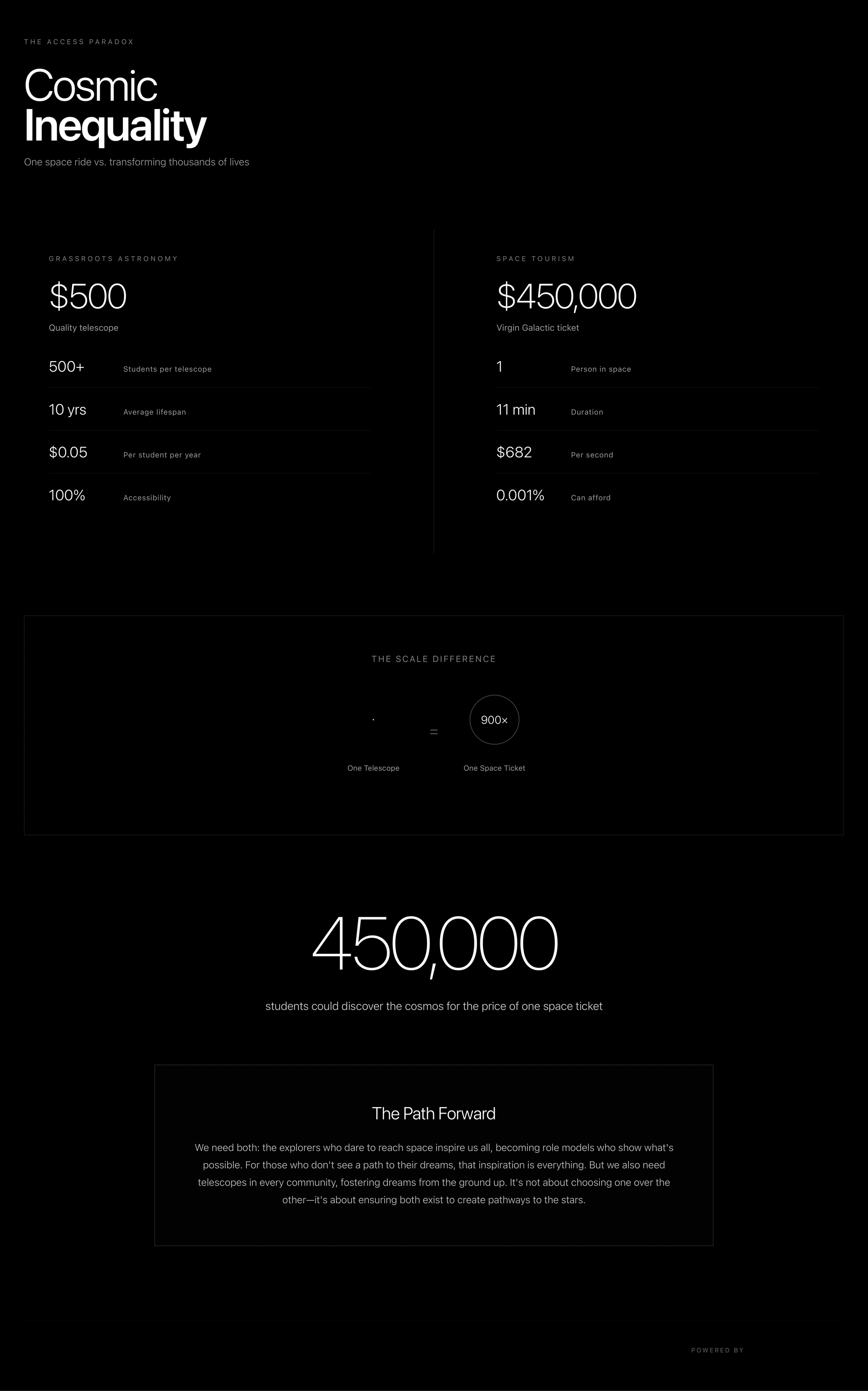 The inequality reflects misplaced priorities, not resource scarcity. "We have the resources to give every child on Earth access to a telescope. We choose not to. We'd rather sell rides to space for the wealthy than bring space to everyone through astronomy."