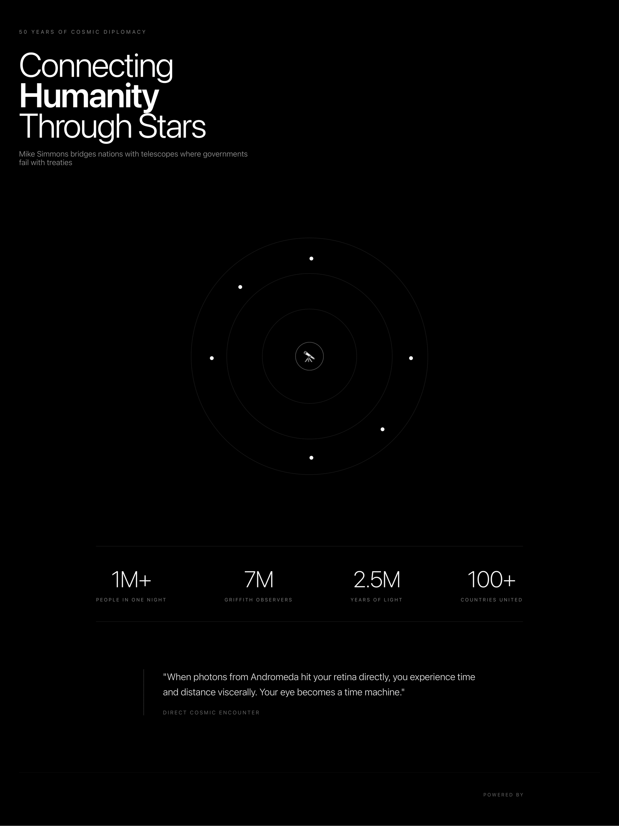 The infrastructure for citizen-based space diplomacy already exists. Radio telescopes can be built from satellite dishes. Smartphones can capture lunar craters. Software for asteroid detection runs on laptops. The question becomes whether we organize this capacity for separation or connection. Seven million people have looked through the Griffith Observatory telescope since 1935, each experiencing what Simmons felt in the California mountains when Andromeda's ancient light reached his naked eye. That direct contact, unmediated by screens or politics, reorganizes human perspective in ways no treaty can replicate.