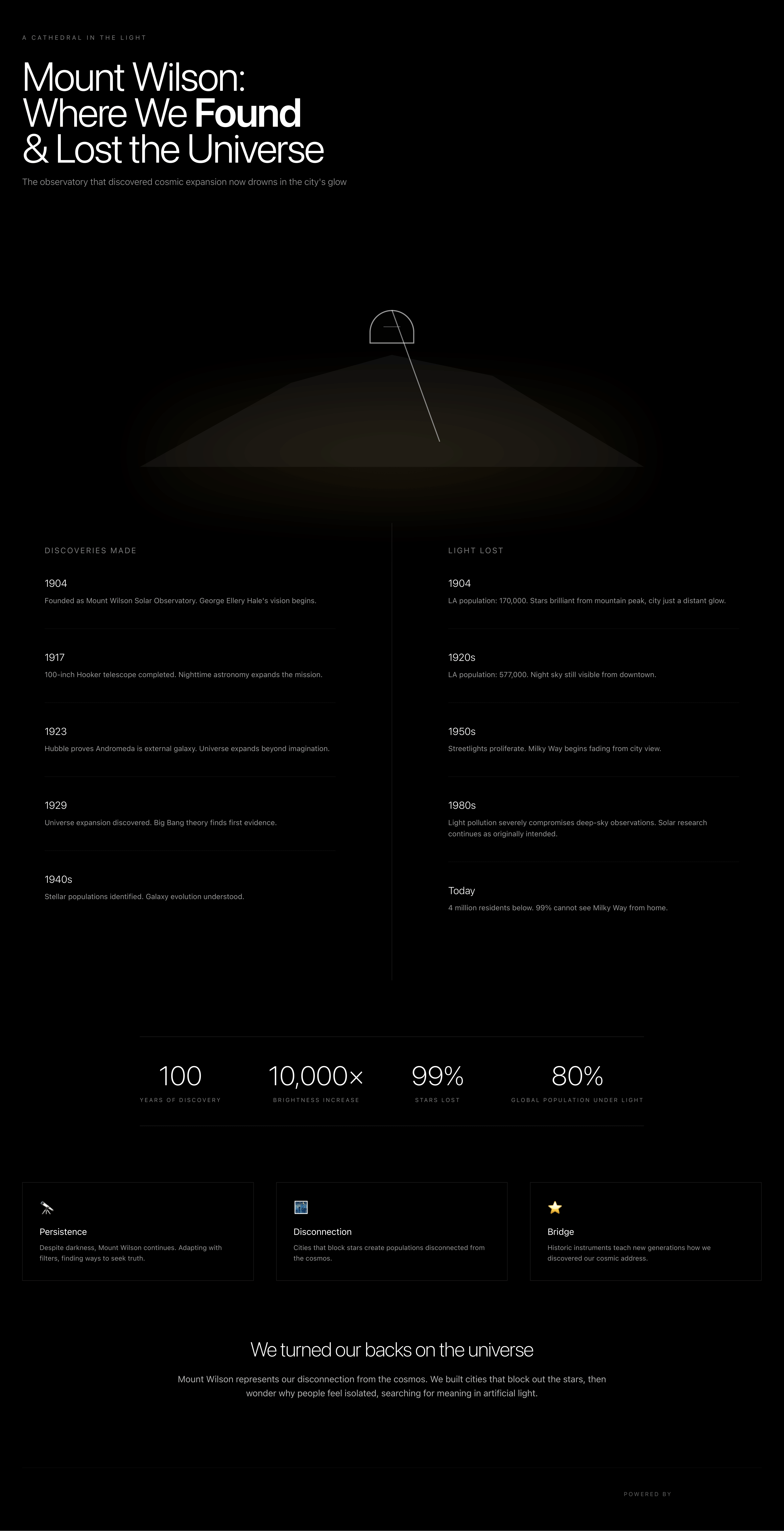 Mount Wilson Observatory sits above Los Angeles's light pollution, a cathedral of astronomy drowning in the glow of the city it watches. What does Mount Wilson's struggle symbolize about humanity's relationship with the cosmos?