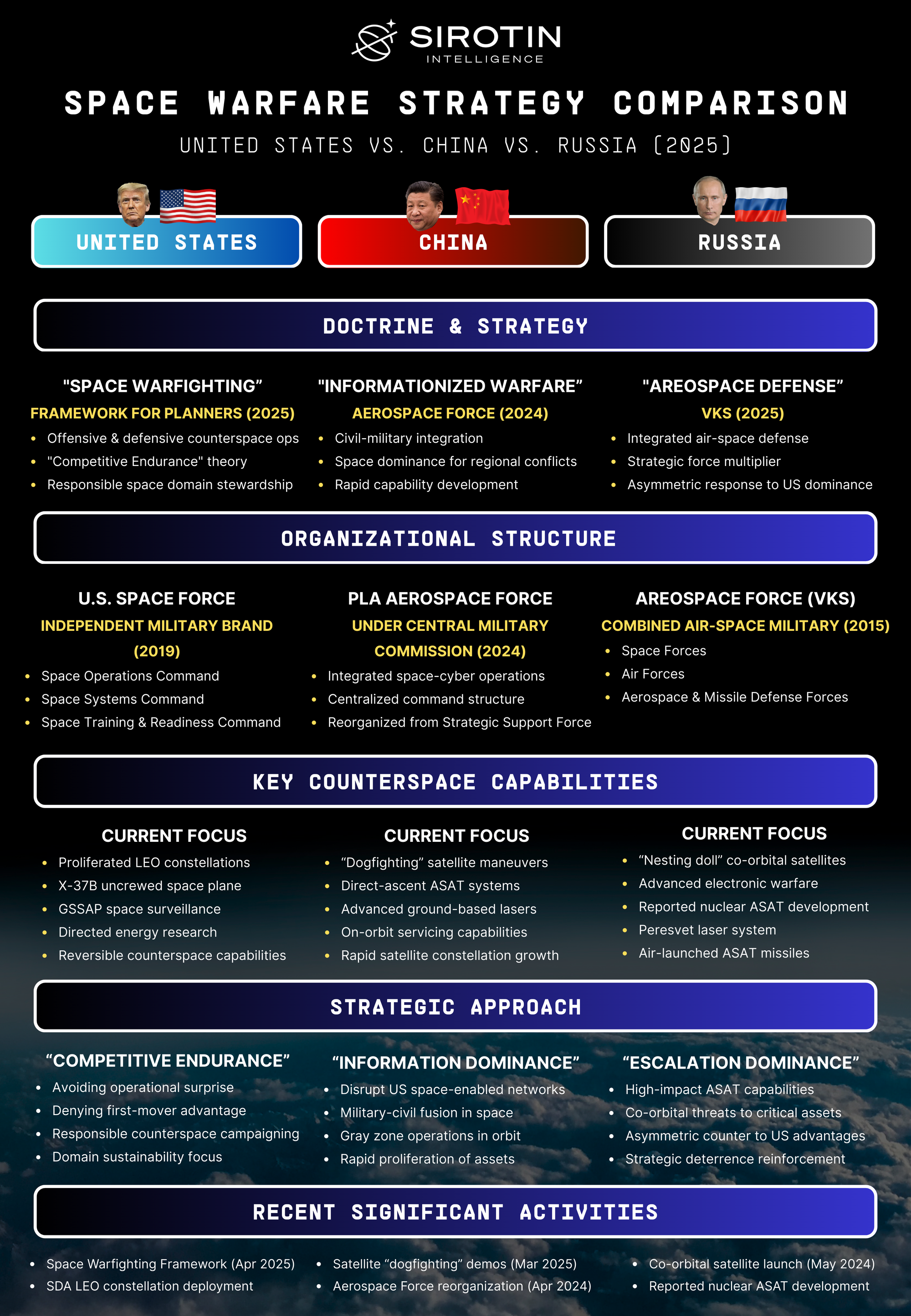 As international competition in space intensifies, this framework positions the US approach against increasingly assertive Russian and Chinese space capabilities and doctrines. Russia has demonstrated aggressive counterspace capabilities including potential orbital weapons, while China has rapidly expanded its space presence with a 560% growth in orbital assets since 2015. The framework signals a more mature and nuanced US posture that balances achieving military advantages with preserving the long-term viability of the space domain.